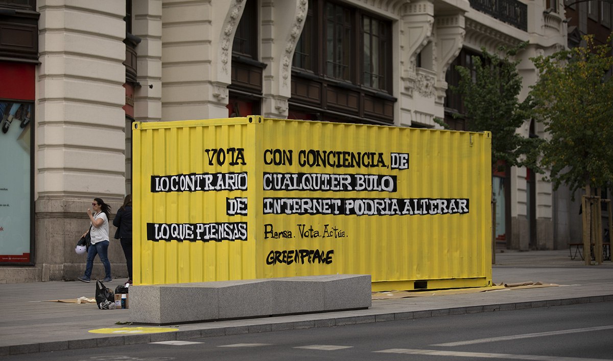 Unos pasos más adelante tenían la respuesta. Al acercarse a la instalación podían ver por fin el mensaje completo: lahora se podía leer “Vota con conciencia, de lo contrario cualquier bulo de internet podría alterar lo que piensas”. Efectivamente, la democracia visibiliza la voluntad popular, pero para que la ciudadanía pueda ejercer su derecho de elegir a sus representantes, es fundamental que esté bien informada. Y la información está ahora amenazada por el auge de las noticias falsas y los bulos que circulan por WhastApp y otras redes sociales.