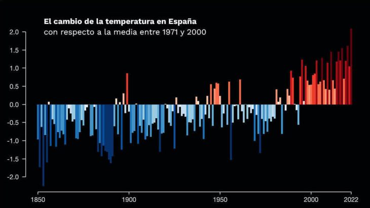 Calentamiento observado en España en forma de gráfico, donde se muestra el aumento de la temperatura media anual del país a lo largo de las décadas comprendidas entre 1850 y 2022 (con respecto a la media entre 1971 y 2000). Iniciativa #ShowYourStripes