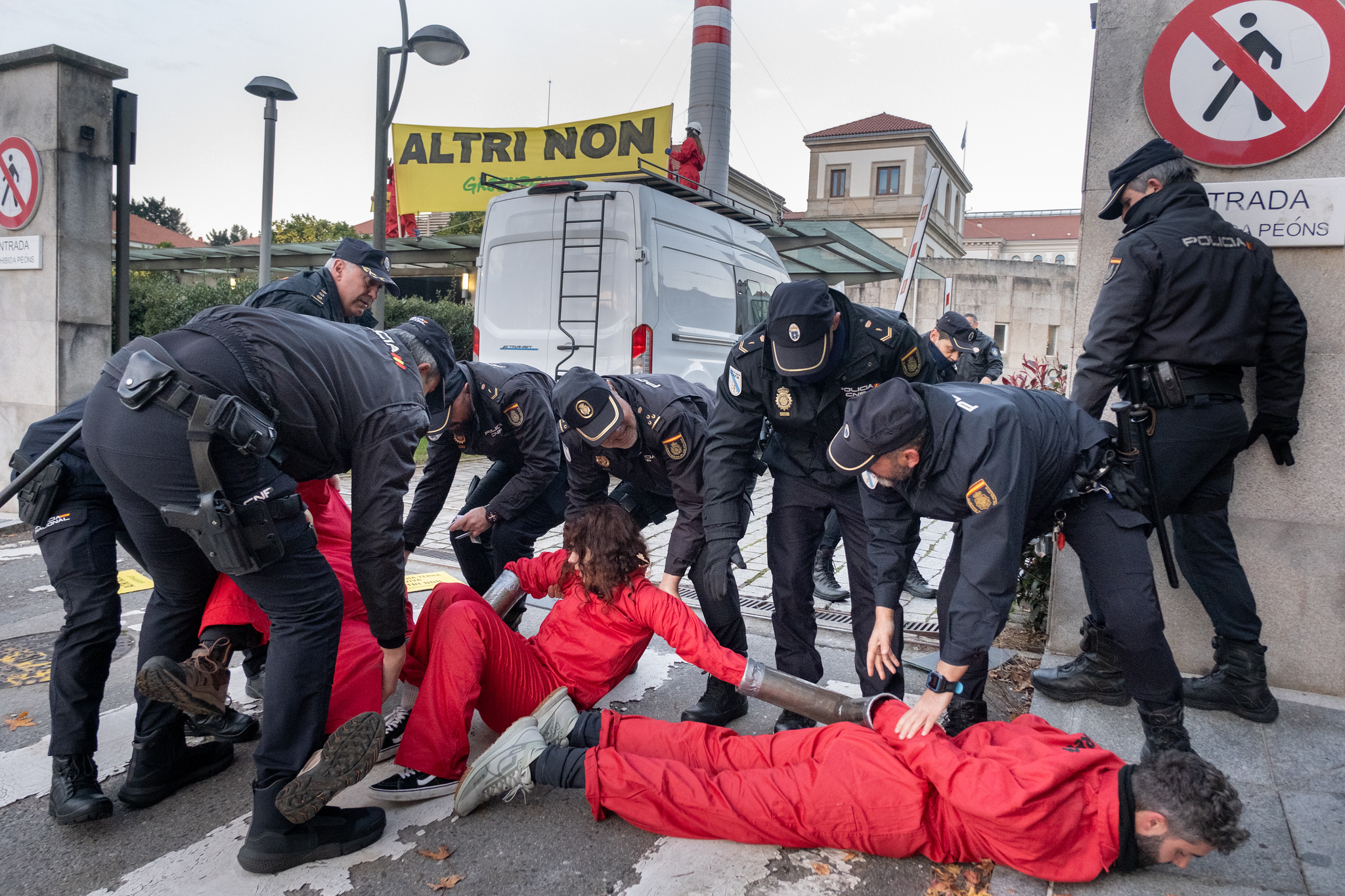 Plantamos en la sede de la @Xunta de Galicia una chimenea humeante de 5 metros con el lema “ALTRI NON” y bloqueamos temporalmente la entrada para exigir que se paralice el monstruoso proyecto de celulosa en el corazón de Galicia.#AltriNon pic.twitter.com/qRDREaGCfb