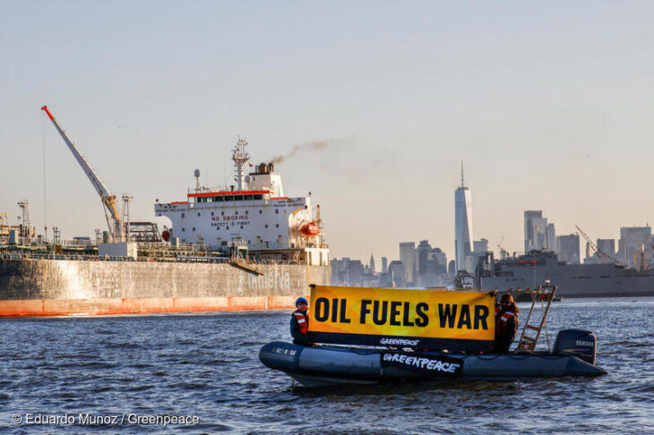 Activistas de Greenpeace USA protestaron por la llegada a la ciudad de Nueva York de un petrolero de 50.000 toneladas que transportaba productos de combustibles fósiles rusos, que a su vez financiaba la guerra de Vladimir Putin en Ucrania.© Eduardo Muñoz / Greenpeace