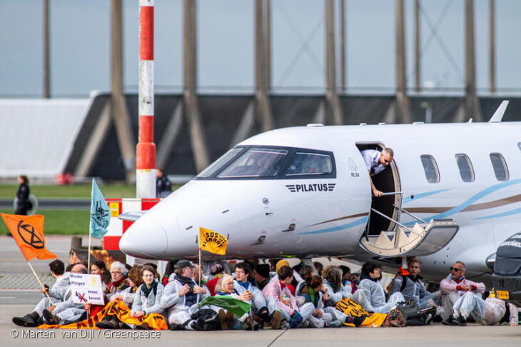 Un gran grupo de activistas de Extinction Rebellion y Greenpeace Países Bajos realizan una protesta pacífica en el aeropuerto Schiphol de Ámsterdam, el segundo más grande de la UE, impidiendo que los aviones privados aterricen y despeguen y se sienten y anden en bicicleta por el área donde están estacionados los aviones privados.© Marten van Dijl / Greenpeace