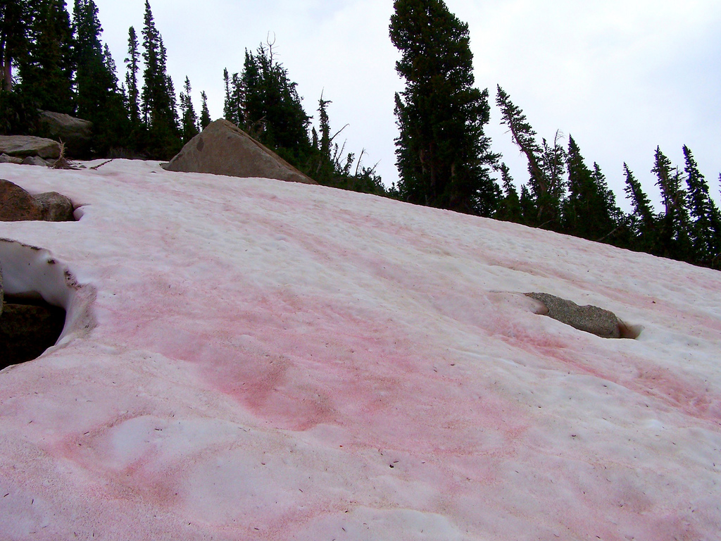 La nieve de sandía aparece en el Ártico, la Antártida, América del Norte y prácticamente en cualquier lugar con nieve. A medida que en verano el sol calienta y derrite los restos de nieve del invierno, las algas verdes (llamadas Chlamydomonas nivalis) que contienen pigmentos secundarios rojos y que viven en el hielo empiezan a reaccionar ante tanto sol y producen una especie de protector solar natural que convierte la nieve en ese color rosáceo característico. ¡Y voilà, nieve de sandía!