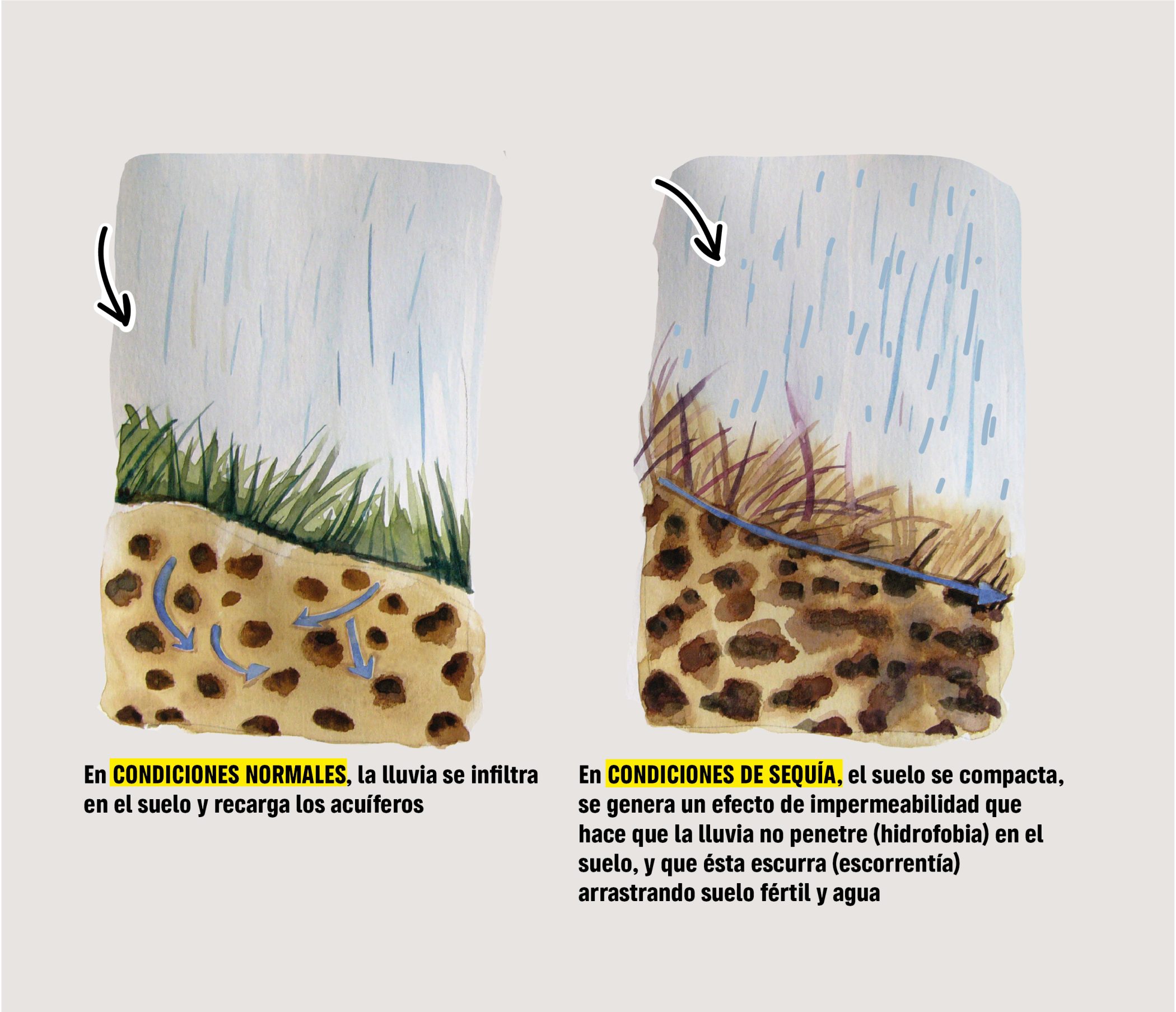 En cuanto hay lluvias intensas, cae estrepitosamente la preocupación y medidas ante la sequía. En el imaginario se considera que estas lluvias compensarán la sequía, pero no es así. Cuando hay precipitaciones intensas en poco tiempo, el suelo no puede filtrar tanta agua y, además, los suelos afectados por sequía pierden la capacidad de infiltrar el agua, como si estuvieran impermeabilizados (hidrofobia), generando arrastres de suelo fértil (escorrentía).