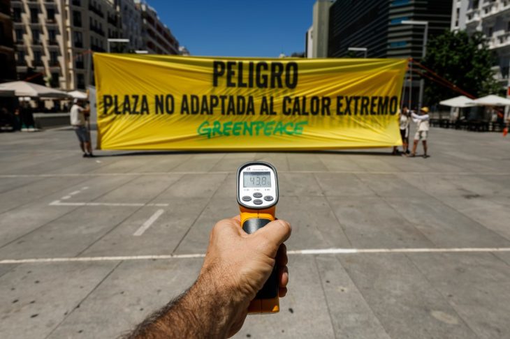 Con este mensaje, activistas de Greenpeace han querido advertir hoy a las personas que pasaban por la plaza Felipe II de Madrid de que es una zona de riesgo ante el calor extremo. Un ejemplo de algo que se repite en muchas plazas de muchos municipios de España. Con sombrillas, sillas y botijos han ofrecido lo que tanto falta en estos espacios. Sombra, agua y descanso. Porque las plazas deben ser un espacio de convivencia para el barrio. Y sin...