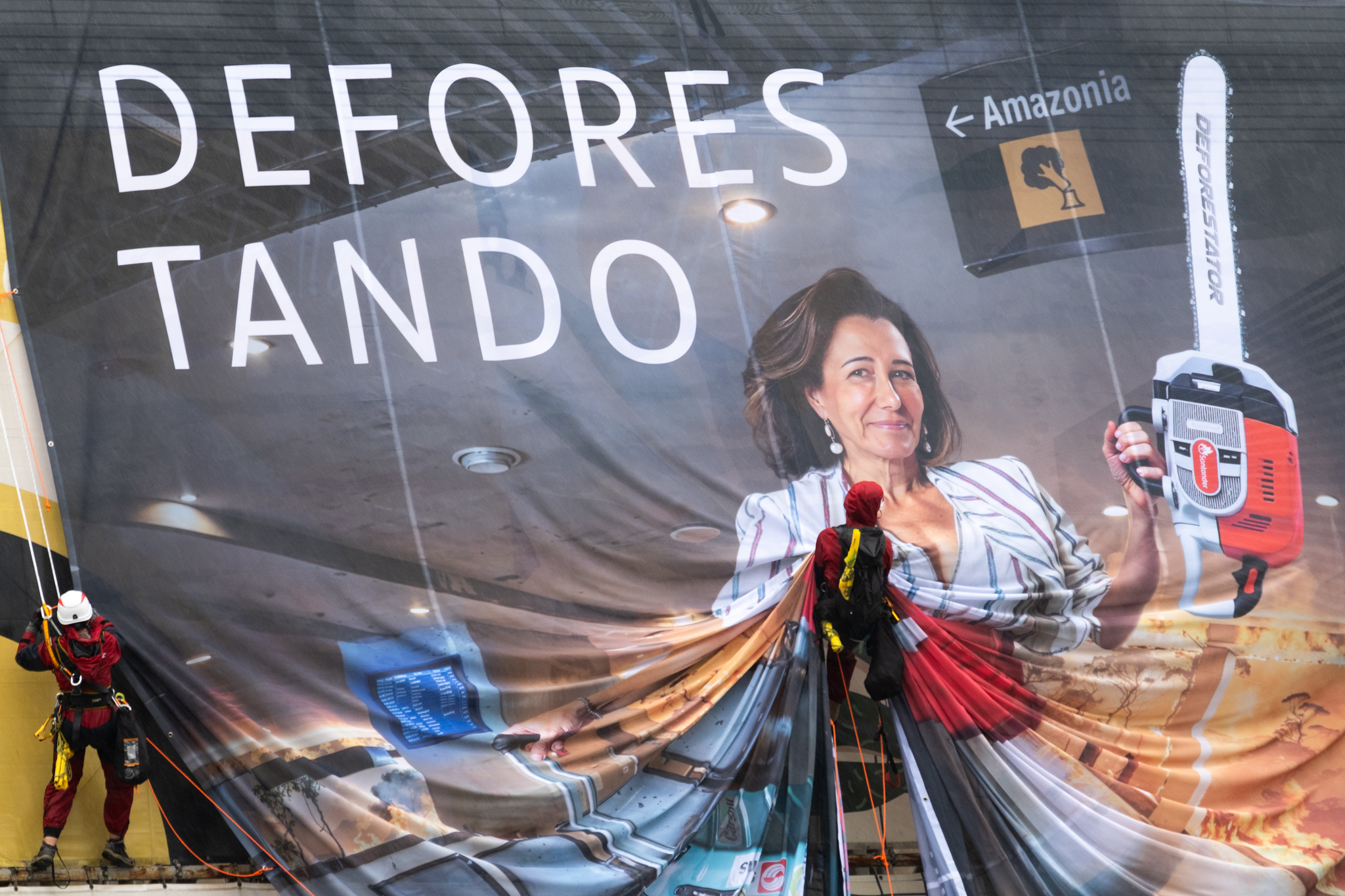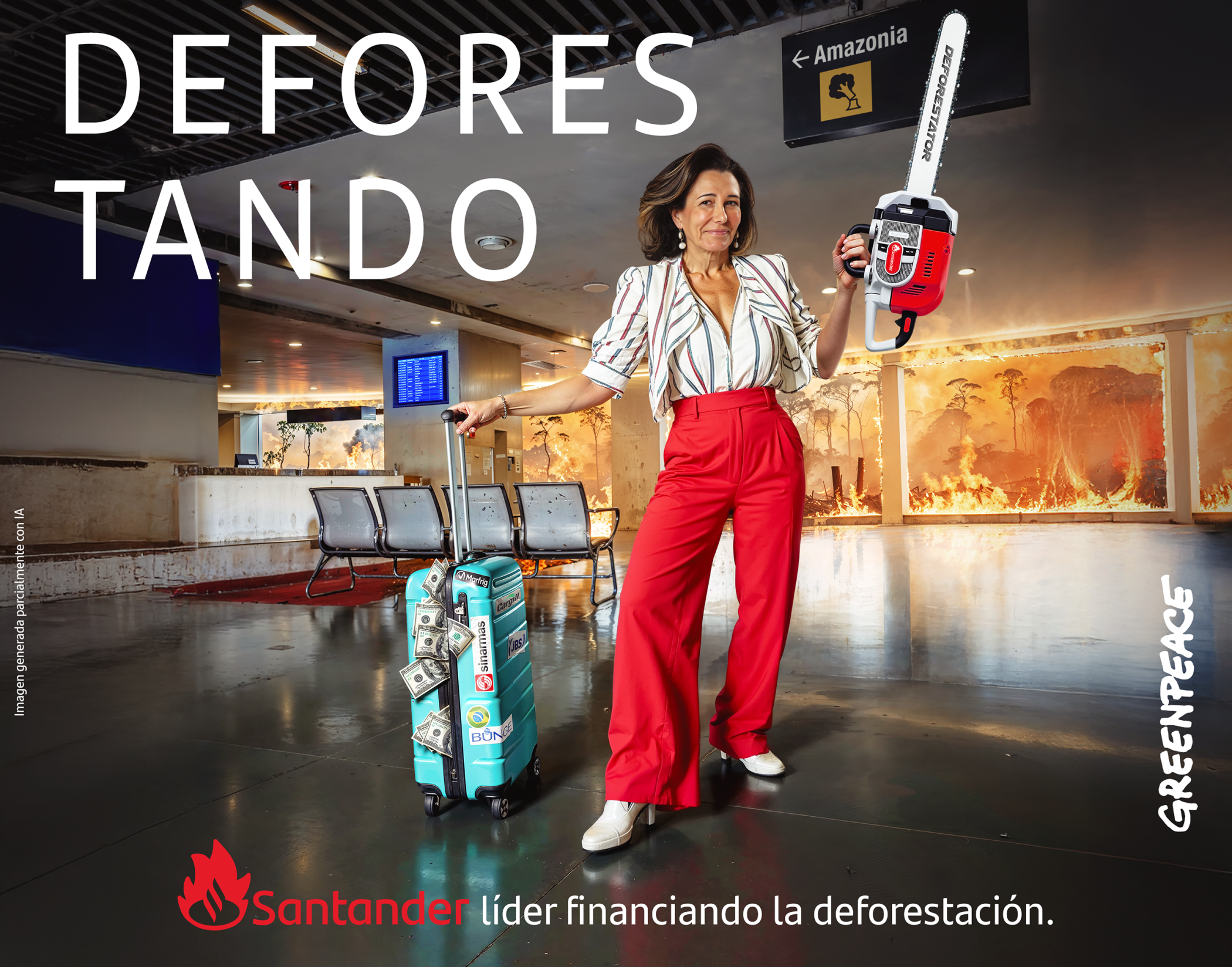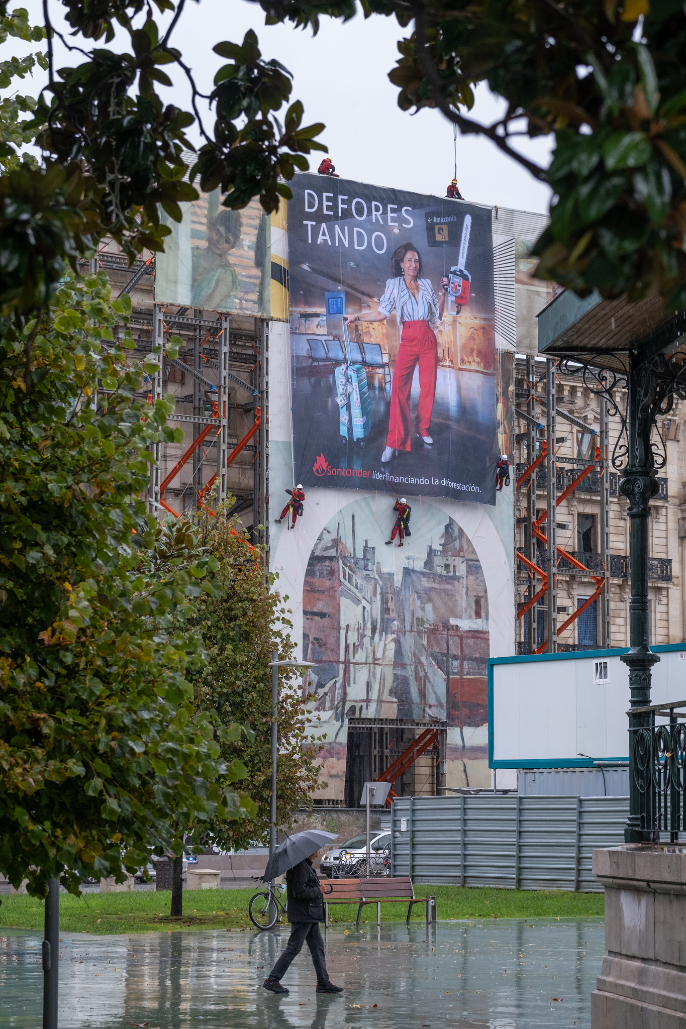 A la dilatada historia del Edificio Pereda habrá que sumar ahora esta imagen de Ana Botín en un aeropuerto, con una motosierra, una maleta llena de dinero, rodeada de incendios forestales y regodeándose de su contribución con la deforestación. “Deforestando”, reza la pancarta que incluye la figura de la presidenta del banco emulando a la cantante Aitana Ocaña y la campaña publicitaria de “bienestando”.