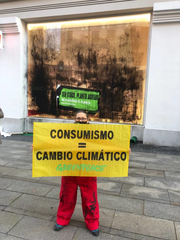 En pocos segundos, con nuestro equipo de activistas, hemos cubierto con pintura negra (ecológica y lavable) los escaparates de PRIMARK, MANGO, H&M y LEFTIES, algunas de las firmas que representan los excesos del consumismo.