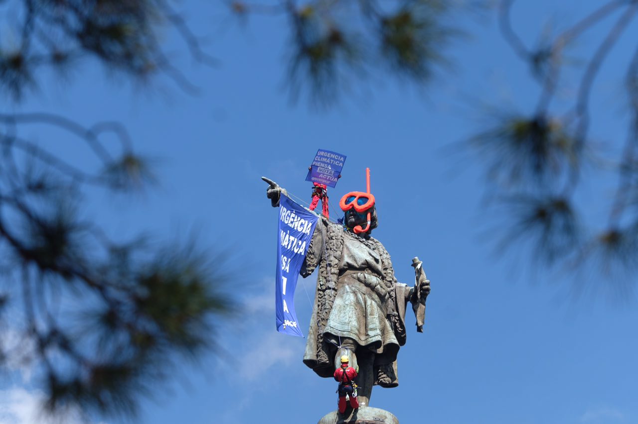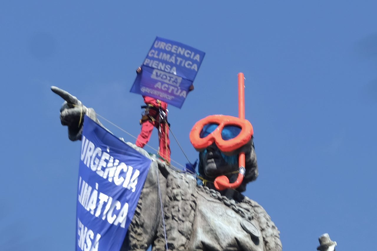 Además de la pancarta, los activistas han colocado unas gafas de bucear a la estatua para visualizar de forma simbólica uno de los muchos impactos que el cambio climático va a ocasionar, como es la subida del nivel del mar. Otros de los impactos que sufriremos son: aumento de temperaturas y olas de calor, efectos sobre la biodiversidad, aumento de especies invasoras, incremento de incendios de alta intensidad, deshielo, desertización o fenómenos meteorológicos extremos cada vez más frecuentes que provocarán también efectos en la salud y en sectores como la agricultura, la energía, el turismo o la alimentación.