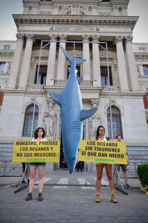 España es líder mundial en el comercio de carne de tiburón con el mayor número de exportaciones entre 2009 y 2019. El tiburón de 5 metros en la puerta del Ministerio se lo recuerda hoy. Nada da más miedo que un océano lleno de tiburones que un océano sin ellos. Se están pescando muchos tiburones en la alta mar sin control pues de cada pez espada que se tiene licencia para pescar la realidad que denuncia Greenpeace es que se pescan ocho tiburones sin ningún tipo de control.