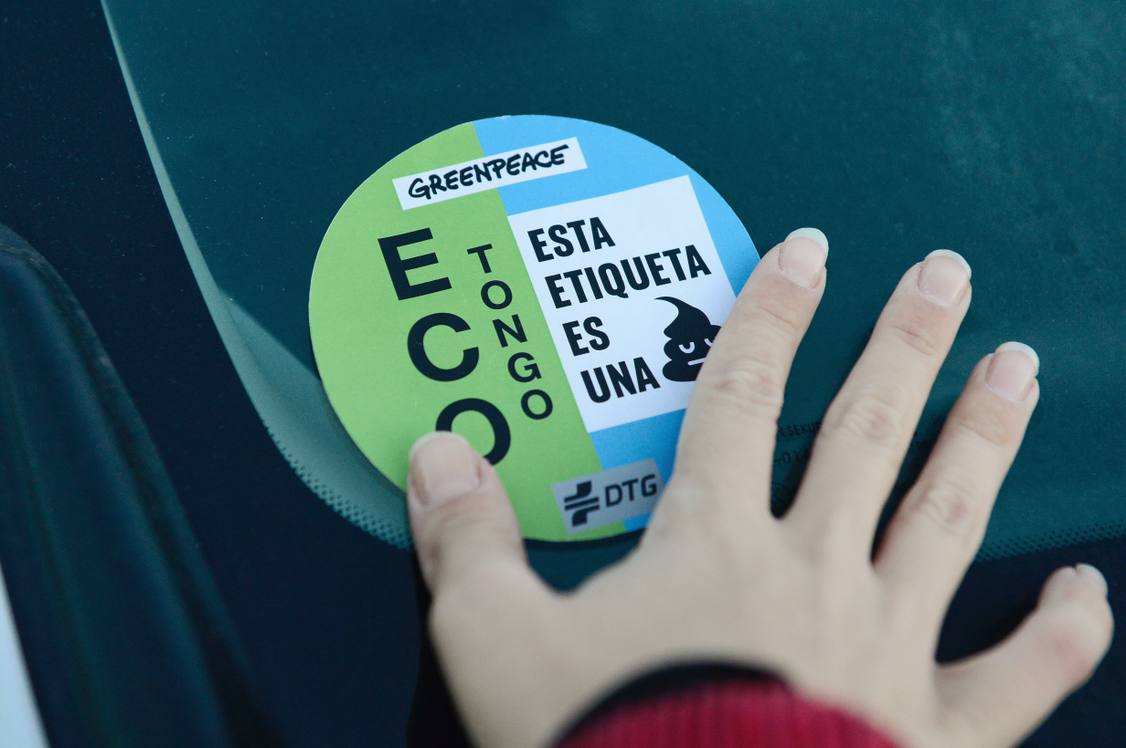 Acción contra el ‘tongo’ de las etiquetas de la DGT, que califican como sostenibles los vehículos de gas entre otras falsas atribuciones. ©Greenpeace/Mario Gomez