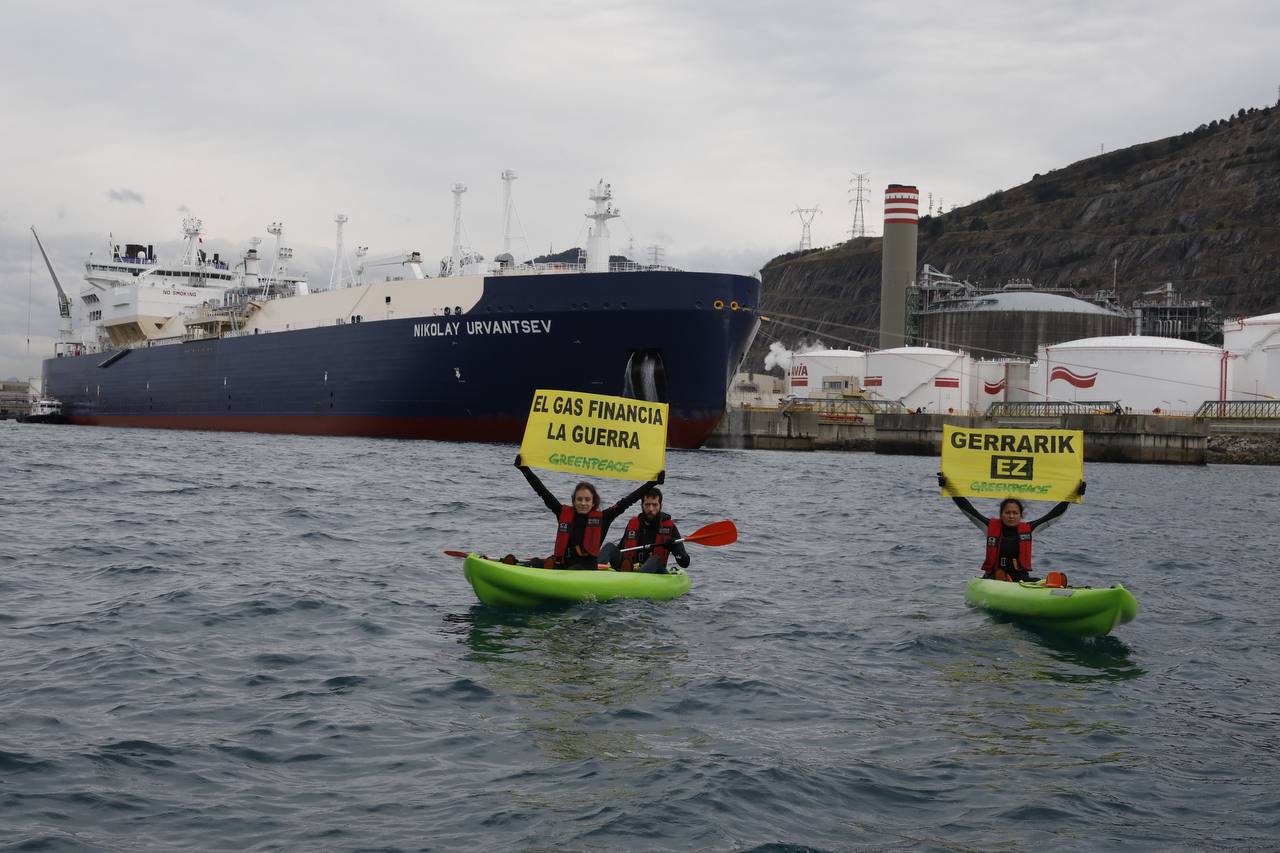 Acabamos de echarnos al agua con dos kayaks en las inmediaciones del puerto de Bilbao para protestar ante el gigantesco buque gasero ‘Nikolái Urvántsev’, procedente de Rusia, y que está descargando su mercancía en la planta de regasificación de Bahía de Bizkaia Gas (BBG), en las inmediaciones del antepuerto de Bilbao.