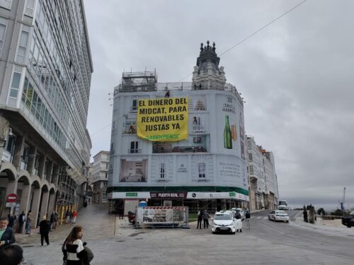 Esta tarde de miércoles hemos desplegado una pancarta gigante frente al edificio donde se reúnen el presidente del Gobierno de España, Pedro Sánchez, y el canciller alemán, Olaf Scholz, en el marco de la cumbre hispano-alemana en A Coruña pidiendo que EL DINERO DEL MIDCAT PARA RENOVABLES JUSTAS ¡YA! porque no necesitamos más infraestructuras de gas.