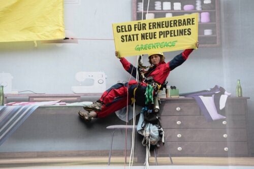 Mientras tanto, varios de nuestros escaladores han logrado desplegar más mensajes, en español, galego y alemán, con la misma reivindicación: el dinero que los gobiernos aún quieren destinar a infraestructuras de combustibles fósiles debe destinarse a energías renovables.