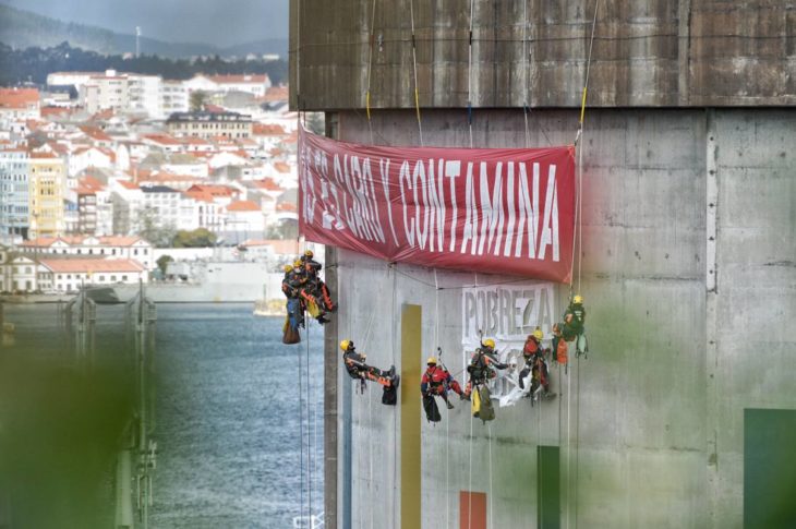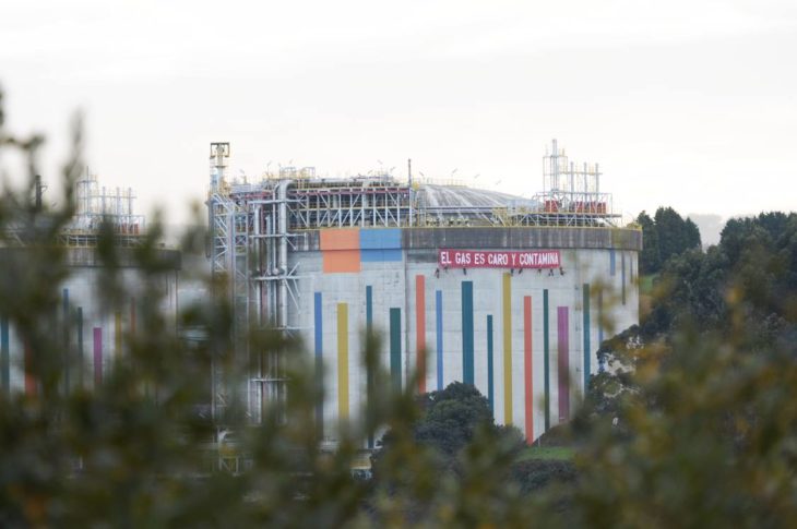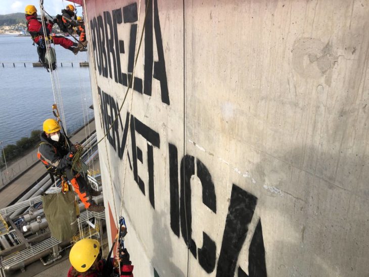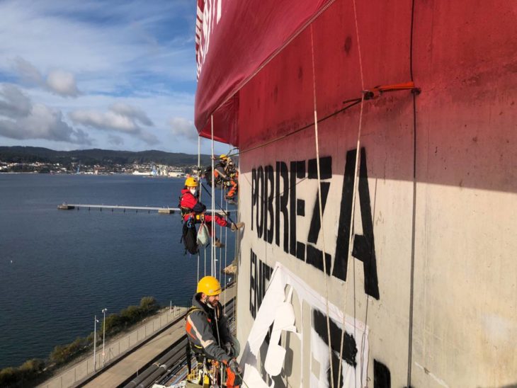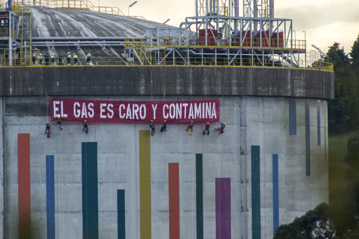 Nuestros escaladores entran en la regasificadora de Reganosa para denunciar la dependencia del gas y nos sumamos a las movilizaciones para pedir su eliminación y la del resto de combustibles fósiles
