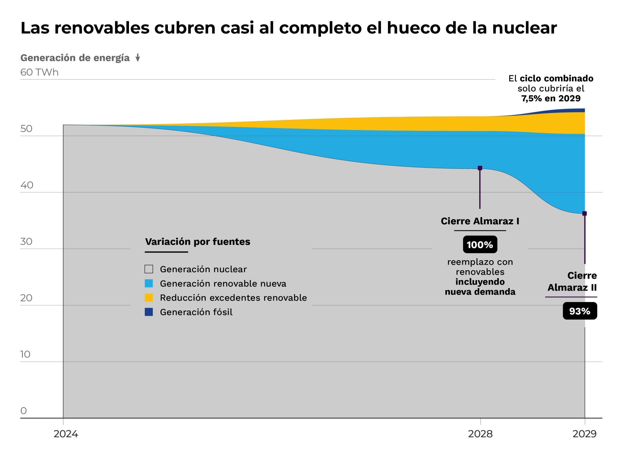 La explicación de por qué las centrales nucleares no se adaptan a los nuevos tiempos renovables y puedan cohabitar se podría resumir en que, como los dinosaurios, son unos gigantes testarudos que generan mucha energía a piñón fijo independientemente que su energía sea necesaria o no, que brille el sol o que sople el viento. Por ello, en un mundo nuevo donde decenas de miles de plantas generan o almacenan energía verde de manera autónoma y descentralizada, estos dinosaurios inflexibles no encajan. Una de las desventajas de la energía nuclear es que actualmente obligan al operador del sistema a desconectar plantas renovables (energía gratis del sol y el viento) para que las nucleares puedan seguir a la suya. Un informe de Aurora Energy señala que el cierre de la central nuclear de Almaraz reduciría los vertidos de energías renovables en la provincia de Cáceres y Badajoz un 30%. Paralelamente, el informe de la URJC y la UPC revela que las energías renovables sustituyen tranquilamente el 96,4% de la electricidad generada por Almaraz.