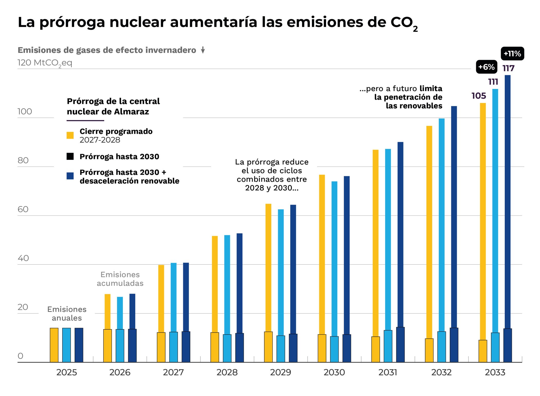 Los dinosaurios son muy interesantes y nos fascinan pero esto no nos debe impedir ver que son peligrosos y que no pueden vivir en nuestro presente. Lo mismo pasa con la energía nuclear: es una energía peligrosa por el riesgo de accidente, pero también porque genera residuos radiactivos que están activos miles de años y, pese a lo que se suele decir, indirectamente emiten CO2. El estudio analiza las emisiones de CO2 en el periodo 2026-2033, que ocasionan las centrales de gas fósil en el sistema eléctrico con y sin Almaraz (aunque nuestro sistema eléctrico ya es muy renovable aún emplea gas fósil como respaldo). En el caso de prórroga de la central, el estudio prevé que se usen más dado que se ralentiza la inversión en nuevas plantas limpias. Como resultado, el sistema eléctrico resultante emite tanto CO2 extra como todos los hogares de Extremadura juntos durante 6 años.