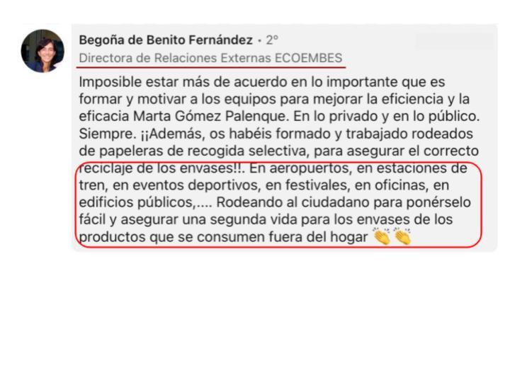 El exagerado optimismo de Ecoembes lo traslada a las redes sociales. Como ejemplo, esta conversación extraída de la red social Linkedin donde la directora de Relaciones externas de Ecoembes presume de gestión ante una representante del Ministerio de Transición Ecológica.