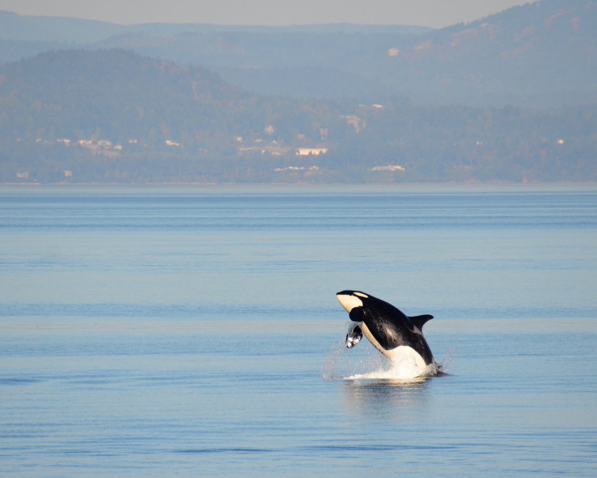 Ejemplar de orca residente del sur en el Mar de Salish, en la frontera entre Canadá y Estados Unidos. La construcción de un oleoducto en esta zona aumentaría 7 veces el tráfico de buques cisterna —que trasladan enormes tanques de petróleo— en la costa del océano Pacífico, lo que podría interrumpir los patrones de alimentación de las orcas en peligro y llevarlas a su desaparición.