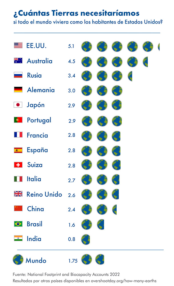 A nivel mundial, con la media de todos los países, el último cálculo disponible, el de 2024, marcó el 5 de junio como día de sobrecapacidad global, es decir, 1,75 planetas consumidos. Si te preguntas cómo es posible consumir más de 1 planeta, a pesar de que solo tengamos uno, es porque, como te contábamos más arriba, vivimos lapidando las reservas de la Tierra.