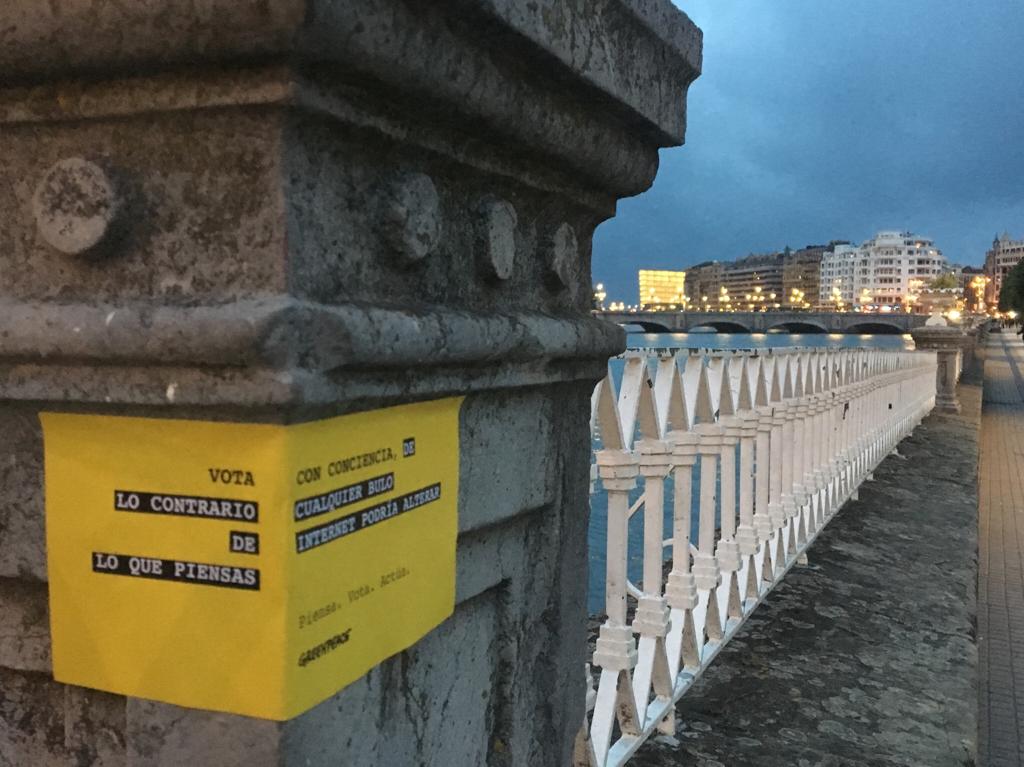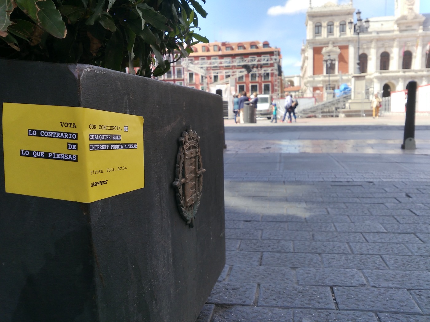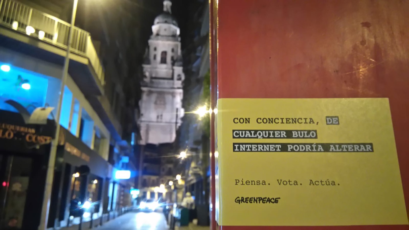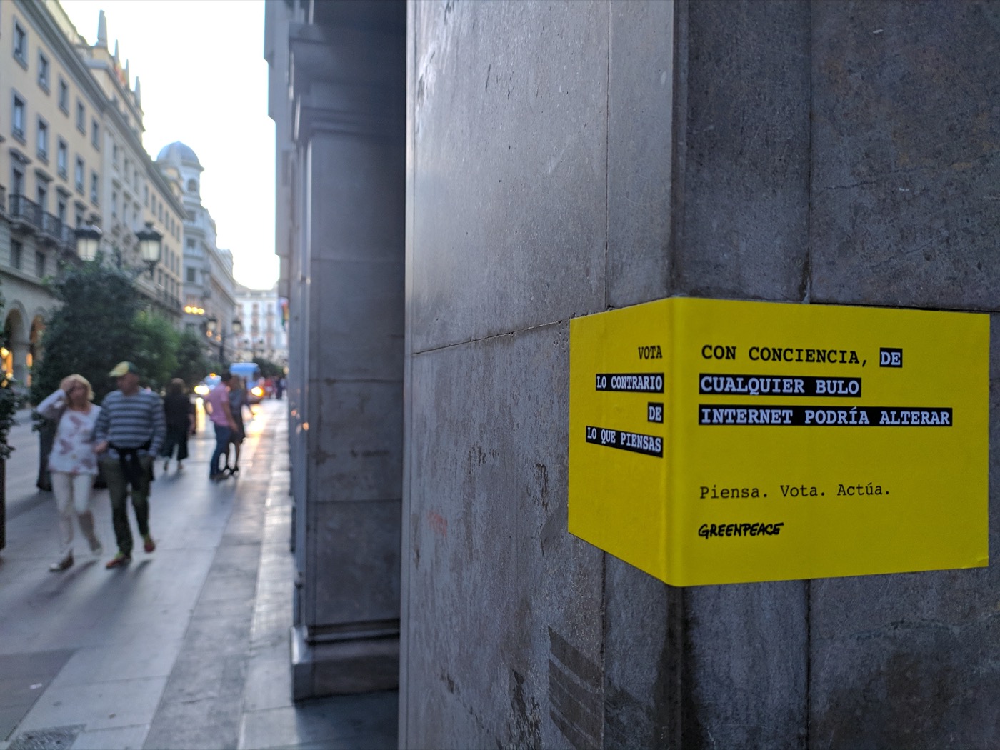 En Greenpeace hemos hecho una investigación para sacar a relucir los bulos de WhastApp, que podéis consultar aquí, y hemos expandido el mensaje «Vota con conciencia, de lo contrario cualquier bulo de internet podría alterar lo que piensas” por toda la geografía española, podéis verlo en este fotoblog: