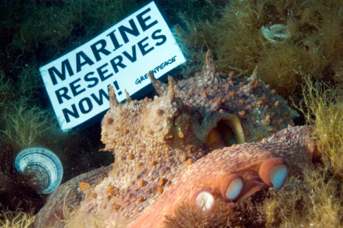 Una pancarta submarina con el lema «Reservas Marinas Ahora» junto a un pulpo.