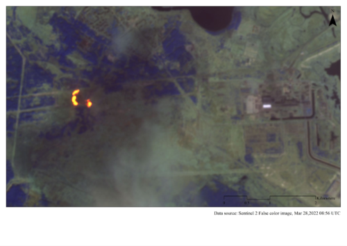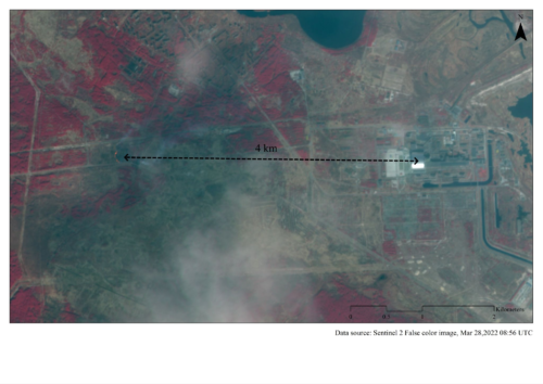 Imagen del satélite Sentinel-2 (28 de marzo de 2022), podemos ver que la dirección del penacho es hacia el noreste, más o menos en dirección a la ciudad de Slavutych