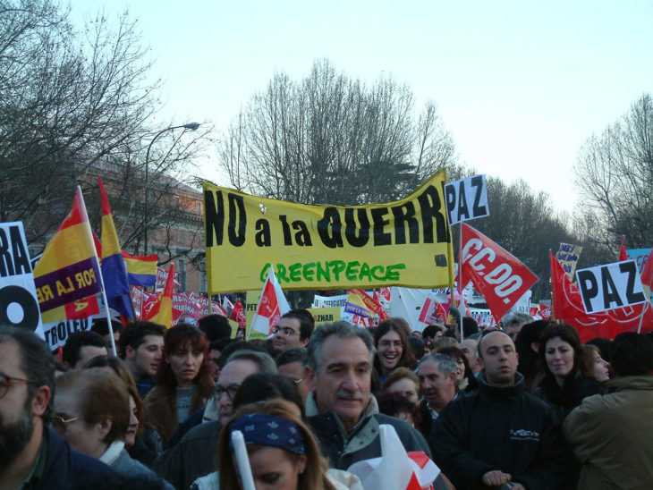 El 15 de febrero de 2003 millones de personas salieron a las calles en ciudades de todo el mundo. El «No a la guerra» y el “No más sangre por petróleo” fueron los lemas que gritamos para oponernos a la guerra de Irak de 2003. Estados Unidos aseguró que este país poseía armas de destrucción masiva e intervino y bombardeó Bagdad, dando inicio al conflicto para controlar los recursos energéticos de los iraquíes.