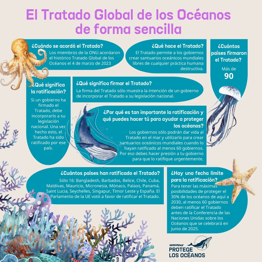 Somos un país que ama el mar, un mar que casi nos rodea al 100%. Nos encanta disfrutar de unas playas limpias y llenas de vida, bucear en aguas cristalinas y ver las especies marinas que viven en ellas y alardear de los productos del mar que tenemos y la cocina tradicional. Los océanos están conectados entre sí por las corrientes marinas, son un verdadero tesoro que debemos cuidar, no solo por el bien del planeta, sino por nuestro propio bien ya que nuestra vida depende de ello. Además de velar por la protección de nuestras costas debemos asegurar la protección de los ecosistemas claves en alta mar. Vamos a seguir luchando para lograr que estos santuarios oceánicos se hagan efectivos y mejore la salud de nuestros océanos. Pero para ello debemos lograr que 60 países ratifiquen este Tratado y no vamos a parar hasta conseguirlo.