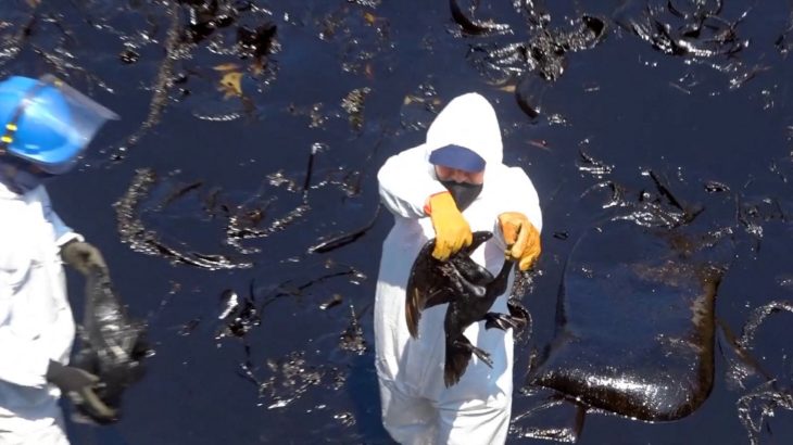 Trabajadores sostienen aves marinas cubiertas de petróleo oscuro en una playa peruana en Ventanilla, Perú, el miércoles 19 de enero de 2022. La Refinería Pampilla, parte de la empresa española Repsol, dijo que se había producido un derrame limitado de petróleo frente a la costa de los distritos de Callao y Ventanilla, cerca de Lima. (Foto de EyePress News / EyePress vía AFP)