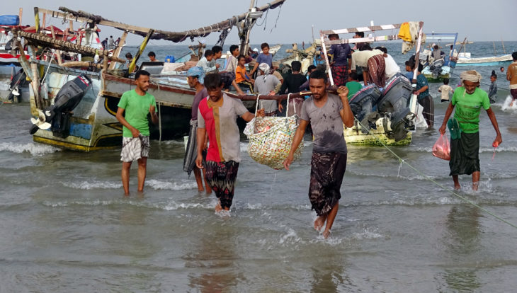 Pescadores yemeníes sacan su captura de los botes en una playa en la costa del Mar Rojo en el distrito de Khokha de la provincia occidental de Hodeida en Yemen, el 12 de julio de 2021.