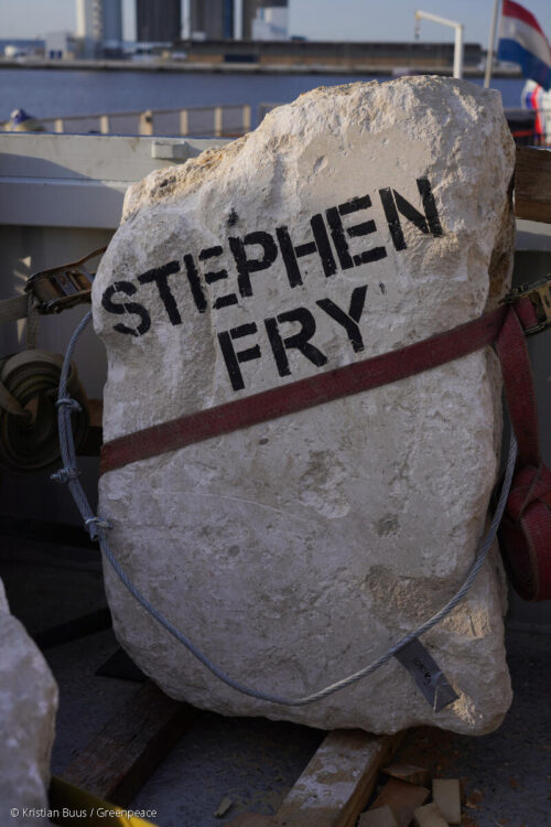 Algunas de las rocas incluyen la ‘firma’ de personalidades que apoyan la acción, como esta con el nombre del actor británico Stephen Fry..