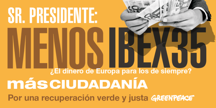 Hoy Greenpeace lanza 5 preguntas dirigidas al presidente de gobierno Pedro Sánchez. Y el formato elegido ha sido una campaña publicitaria en autobuses en el centro de Madrid hoy lunes, y en soportes de mobiliario urbano, marquesinas mañana martes. Esperamos que el mismo presidente u otros miembros del gobierno de coalición puedan recoger estas preguntas y darles una respuesta.