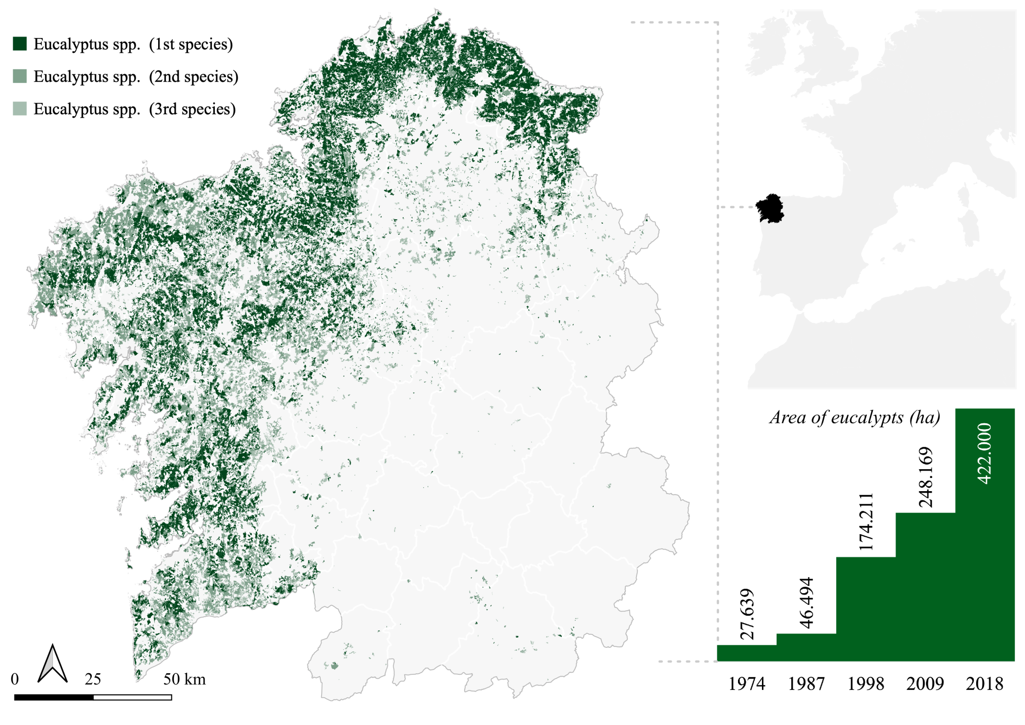 Fuente: Paül, V. y Cidrás D. 2025. Los Paisajes del Eucalipto en Galicia. En: Bernárdez Villegas, J.G. & Rigueiro Rodríguez, A. (Coords.): El eucalipto en Galicia. Monografías do IBADER – Serie Biodiversidade. Ibader. Universidade de Santiago de Compostela. Lugo.