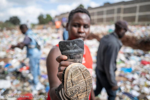 Una reciente investigación de Greenpeace ha destapado la realidad oculta tras la ropa que se envía desde Europa y China para su reventa en algunos países africanos. Toneladas de ese material textil acaba en vertidos incontrolados. En la foto, Kibera Slum sostiene una zapatilla de Adidas en Nairobi.