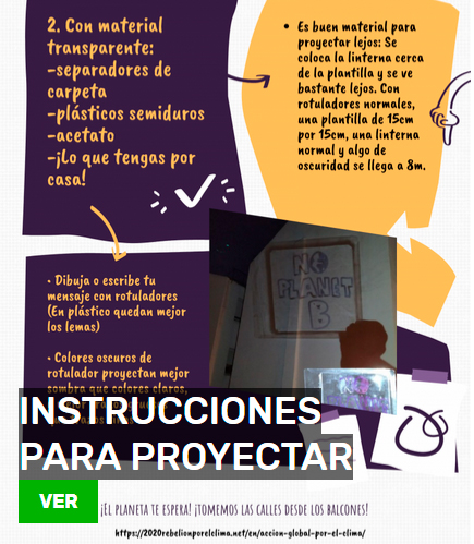 - ¿Qué? Vamos a manifestarnos dentro de casa proyectando sombras (con linterna o lámpara), imágenes con proyector en el exterior o poniendo sonido a todo volumen de ventana a ventana, de balcón a balcón y compártelo en redes: haz una foto o un vídeo de tu proyección y compártelo en Facebook, Instagram, Twitter… Menciónanos a @greenpeace_esp para que podamos ver la foto o el vídeo ¡y lo podamos compartir!