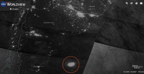 En el círculo rojo, luminosidad provocada por las flotas de pesca de calamar frente a las costas argentinas. Los barcos utilizan grandes lámparas en el agua para atraer a los calamares.