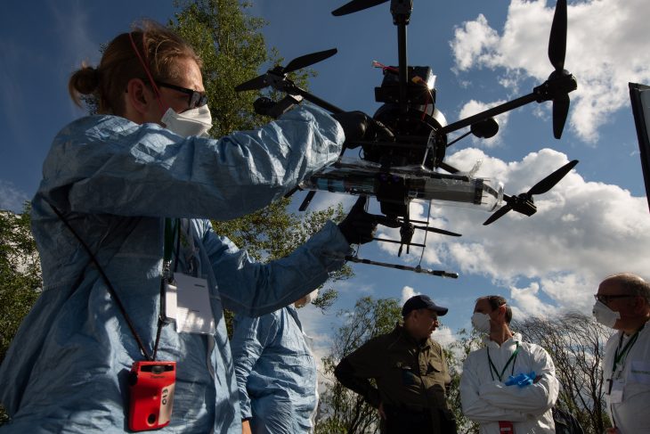 Adrian Kaul, operador de drones de Greenpeace Alemania, trabajando con el dron sensor de espectrometría gamma EcoOwl. – Serhii Kirieiev (con chaqueta verde y gorra), director general del SSE EcoCentre, con el equipo de investigación de Greenpeace Chernóbil recorre los laboratorios científicos del centro de Chernóbil, toma muestras de tierra para detectar la radiación alterada y documenta los daños causados por la reciente ocupación militar rusa de la zona de exclusión de Chernóbil, en Ucrania, 15 de julio de 2022.