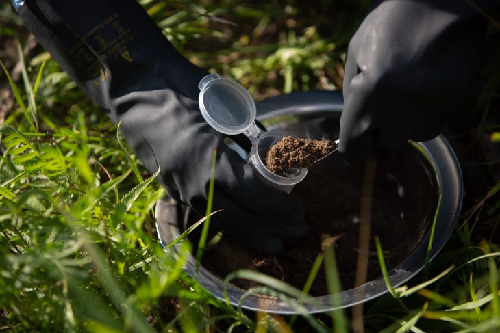 Jan Vande Putte, asesores de protección contra la radiación de Greenpeace Bélgica, del equipo de investigación de Greenpeace Chernóbil mientras extraen muestras de tierra radiactiva para su análisis en la zona fuertemente minada donde se construyeron trincheras y estructuras por los militares rusos durante la ocupación en 2022 de la zona de exclusión de Chernóbil. La zona de exclusión de Chernóbil, Ucrania, 15 de julio de 2022.