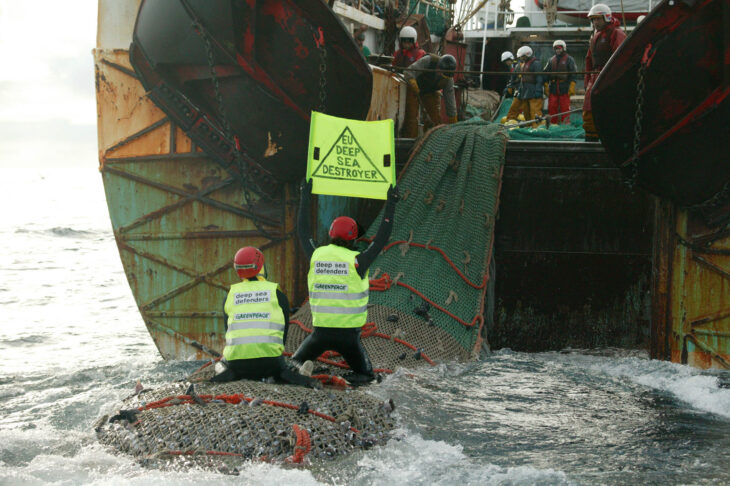 Activistas de Greenpeace suben a la red de arrastre del buque arrastrero Playa de Menduiña. Greenpeace denuncia la destrucción causada por este método de pesca y demanda a Naciones Unidas una moratoria sobre este destructivo arte de pesca. ©Greenpeace/Kate Davison