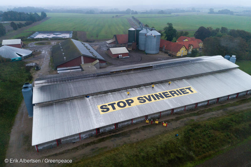 Activistas de Greenpeace protestan en una planta industrial de cerdos en Dinamarca.