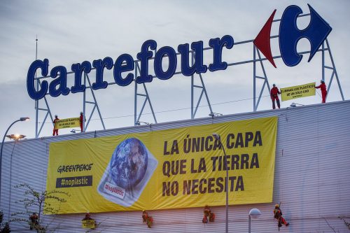 En el Día de la Tierra (22 de abril) descolgamos dos grandes pancartas en un hipermercado para denunciar el uso masivo e innecesario de plásticos de un solo uso con los que los establecimientos alimenticios cubren sus productos. Un globo terráqueo envuelto en plástico junto a la frase «La única capa que la tierra no necesita» fue el mensaje elegido para las pancartas.