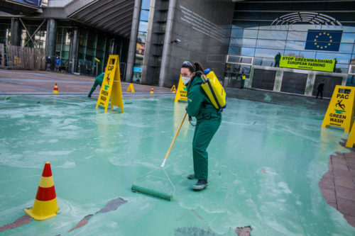 Activistas de Greenpeace pintan de verde la entrada del Parlamento Europeo para denunciar el “greenwashing” de la PAC
