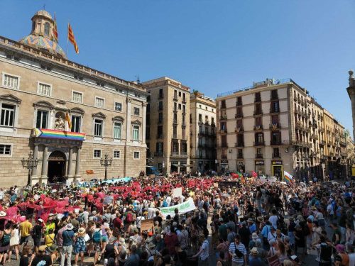 Miles de personas se concentran en la plaza Sant Jaume en contra de la ampliación del aeropuerto de El Prat