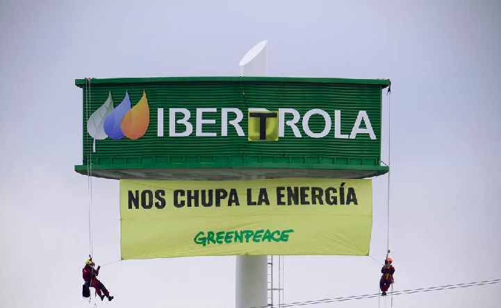 Esta mañana, en el Día Internacional Contra el Cambio Climático, escaladores de Greenpeace han ascendido hasta la torre de la sede de Iberdrola en San Agustín de Guadalix (Madrid) y han troleado su logo, transformándolo en “IberTrola”. Además han desplegado una pancarta con el mensaje “Nos chupa la energía”, en referencia a la compañía eléctrica.
