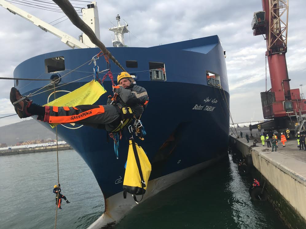 Activistas de Greenpeace protestan en Bilbao contra el envío ilegal de armamento que podría ser usado contra civiles en la guerra del Yemen