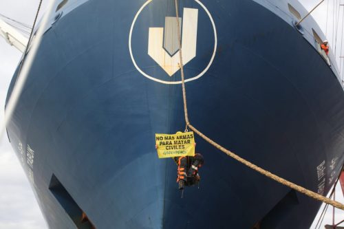 Activistas de Greenpeace de varias nacionalidades protestan en esto momentos en Bilbao contra el envío de armamento con destino a los países de la coalición liderada por Arabia Saudí en la guerra del Yemen. Con esta acción de protesta pacífica, los activistas denuncian que estas armas pueden ser usadas contra la población civil en la cruenta guerra del Yemen, que le ha costado la vida a miles de personas inocentes. Greenpeace acusa al Gobierno de España de ser cómplice de esta situación por permitir la venta de este material y le exige que le ponga fin.