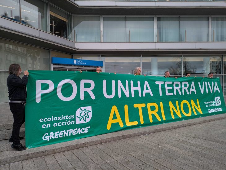 Activistas de Ecologistas en Acción y Greenpeace mostraron hoy en la sede de la Xunta de Galicia en Vigo su rechazo a la Declaración de Impacto Ambiental (DIA) favorable a la instalación de la fábrica de celulosa de Altri/Greenfiber en Palas de Rei. Con carteles en los que se leía “Altri Non”, las organizaciones exigieron por registro a la Xunta de Galicia que, dada la gran controversia social generada en el país y las enormes dudas que existen sobre la limpieza del proceso de evaluación ambiental, haga públicos ya los informes sectoriales en los que se asienta la viabilidad de la planta en la DIA.
