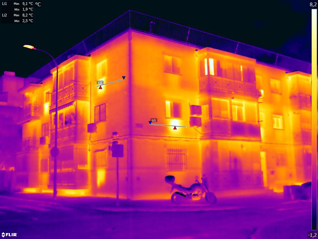 Las fotos muestran, a través de una paleta de colores de amarillos a morados, las diferencias de temperatura en la superficie de un mismo edificio, lo que permite identificar aquellos puntos en los que el aislamiento es más deficiente. Se aprecian fugas por las ventanas, en las esquinas, por el forjado estructural de la casa o por los puentes térmicos, entre otros lugares. lo que confirma la elevada ineficiencia energética de la mayoría de nuestros hogares (que afecta al 95 %, según el INE). En definitiva, nos ofrece un panorama “en naranja y amarillo” que demuestra cómo se escapa la energía (y también el dinero) de nuestras casas.