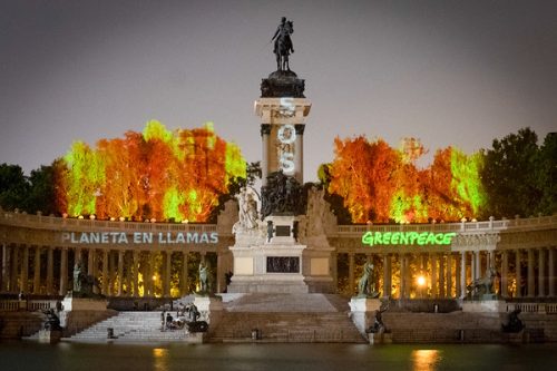 Hoy se celebra el Día de Acción Global por la Amazonía y, con tal motivo, activistas de Greenpeace entraban esta noche en el Parque del Retiro de Madrid para “incendiar” simbólicamente, con proyectores, los árboles que rodean el estanque central, denunciando, de esta manera, el riesgo de la Amazonía y de todos los bosques del mundo ante la inacción y falta de medidas por parte de gobiernos y empresas. Con el mensaje “SOS. PLANETA EN LLAMAS”, la organización ecologista hace un llamamiento para actuar con urgencia frente a la crisis forestal que padece el planeta, y que, previsiblemente, seguirá aumentando.