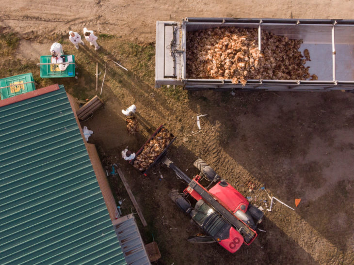 Greenpeace ha sido testigo de cómo se extraen los cadáveres de las gallinas afectadas por el brote de gripe aviar en una macrogranja avícola en Íscar (Valladolid), que ha puesto en alerta a las autoridades y al sector avícola. Miles de cadáveres se están retirando para su transporte al centro de eliminación. La organización ecologista denuncia que la ganadería industrial es una auténtica bomba de relojería y que es urgente poner fin a este destructivo modelo, que pone en jaque la salud del planeta y de las personas.