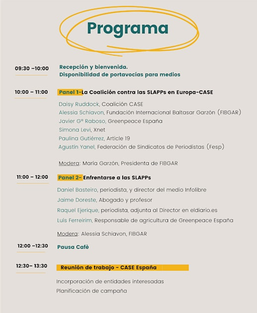 El grupo de trabajo de CASE en España, conformado por la Fundación Internacional Baltasar Garzón (FIBGAR), Greenpeace, Xnet, Article 19 y la Federación de Sindicatos de Periodistas (FeSP), se dedica a la puesta en común de información sobre SLAPP y el monitoreo de casos nacionales, además a estimular y promover iniciativas anti SLAPP y garantizar una transposición de amplio alcance, efectiva y garantista.